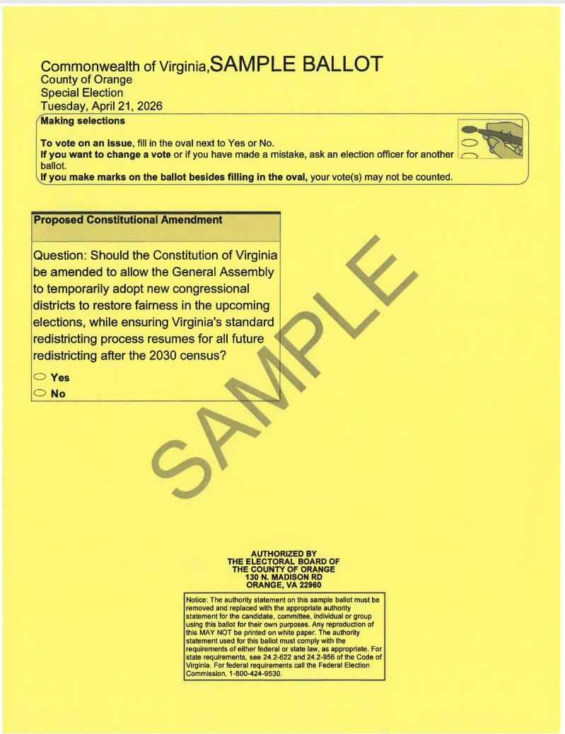 Early & Absentee Voting: Early voting opens – Friday, March 6, 2026. Location: 130 N. Madison Rd., Orange, VA 22960. Early voting hours are 8am-5pm Monday-Friday except the 2 Saturdays as listed below.